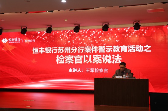 本次活动特别邀请了先后获得“江苏省青年岗位能手”、“省检察机关专门业务人才”、检察系统“十佳公诉人”等荣誉称号的苏州工业园区检察院金融检察部王军检察官授课。王检察官生动地给大家讲解了金融从业人员职务犯罪的“惩与防”,通过对多例金融从业人员职务犯罪反面典型案件的深入剖析,告诫大家要以案为镜、保持警钟长鸣。